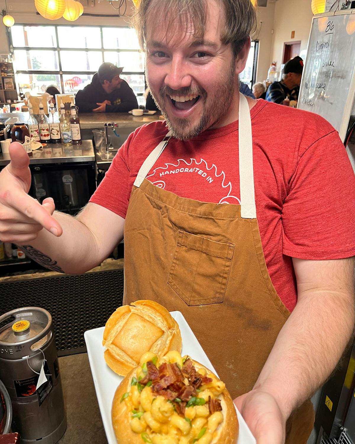 🥘 Looking for comfort food at its finest? Meet Cody, one of our amazing lline cooks at Gyppo! He's showcasing our house-made mac & cheese, a staff meal favorite. Made with Gyppo brewed Dave's Pilsner, smoked Rumiano and Tillamook cheese, sprinkled with crispy bacon and green onions, and served in a sourdough bowl, it’s a true carbohydrate delight! We believe in community unity and supporting our team like family. Come to Gyppo, savor our delicious dishes, and feel the love and community spirit we cherish on the Lost Coast.