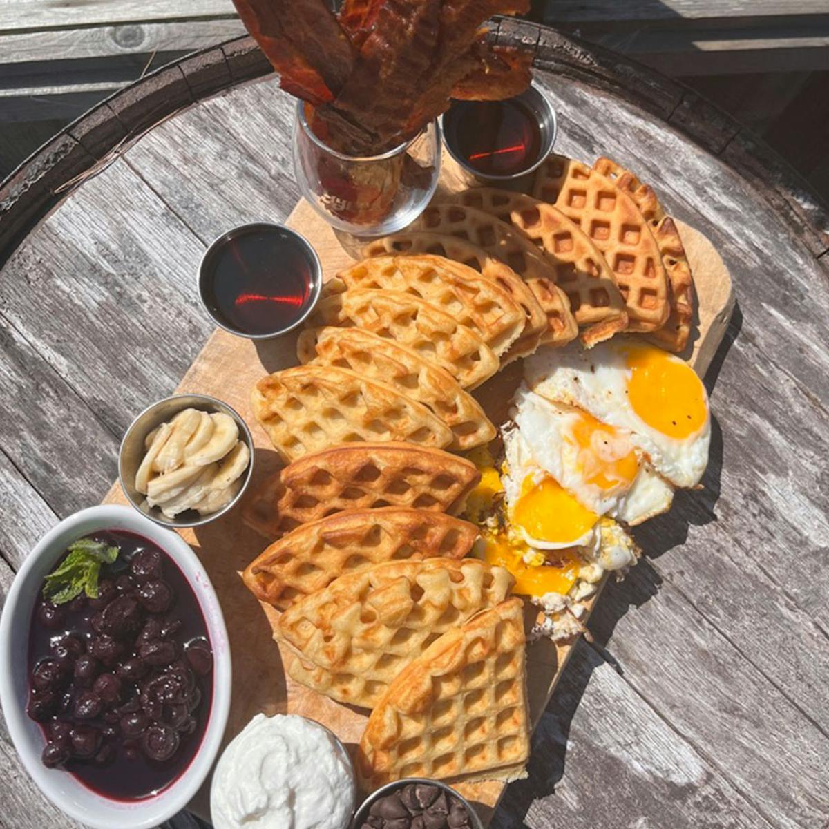Get a load of this! Our Waffle Charcuterie Board is the ultimate brunch indulgence. Who doesn't love a plate full of waffles, sunny-side-up eggs, crispy bacon, and blueberry compote? 🧇🥓🍳 We even serve bacon in a pint glass for that extra wow factor! With chocolate chips, bananas, and whipped cream, this board is perfect for sharing between 2 to 4 people, depending on your appetite. Pair it with a mimosa or michelada for the perfect start to your weekend. Join us at Gyppo Ale Mill for this brunch delight!