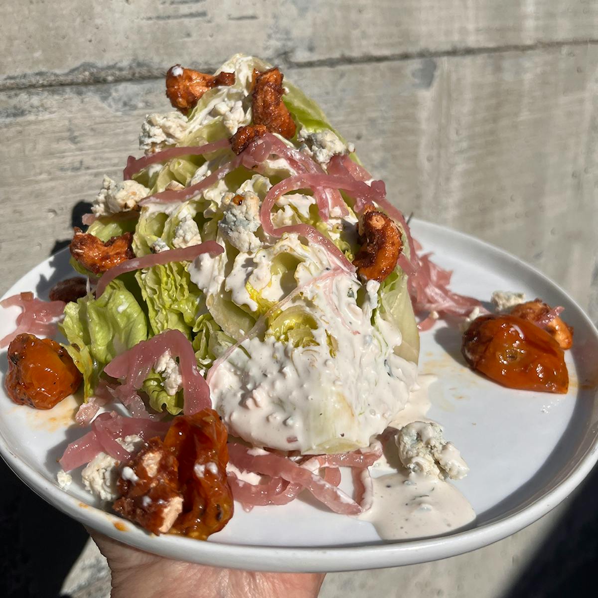 This beauty is topped with roasted tomatoes, pickled onions, candied cashews, and a generous drizzle of J Catering’s incredible blue cheese dressing. It’s a staple at Gyppo, and we love supporting amazing local businesses like J Catering.