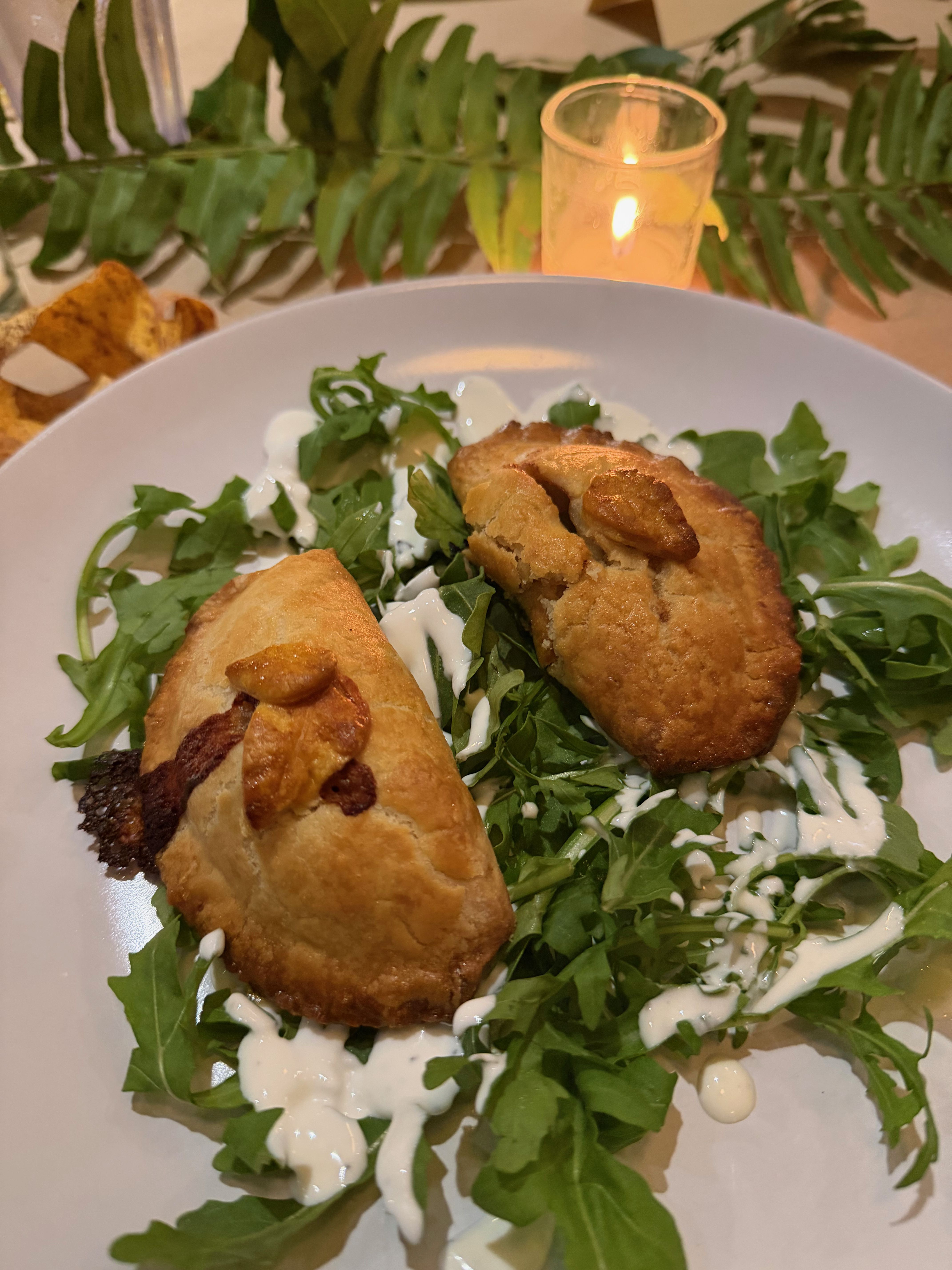 And, as always, they delivered. Their two pies—Pulled Pork, Apple & Sage with apple cider mustard cream, and Mushroom, Caramelized Onion & Gruyère with thyme crème fraîche—were clean, beautifully made, and so full of intention. Having those courses taken off our plate allowed our kitchen to focus on everything else, and it absolutely shaped the ease of the night. Huge gratitude to them, both as friends and as pros.