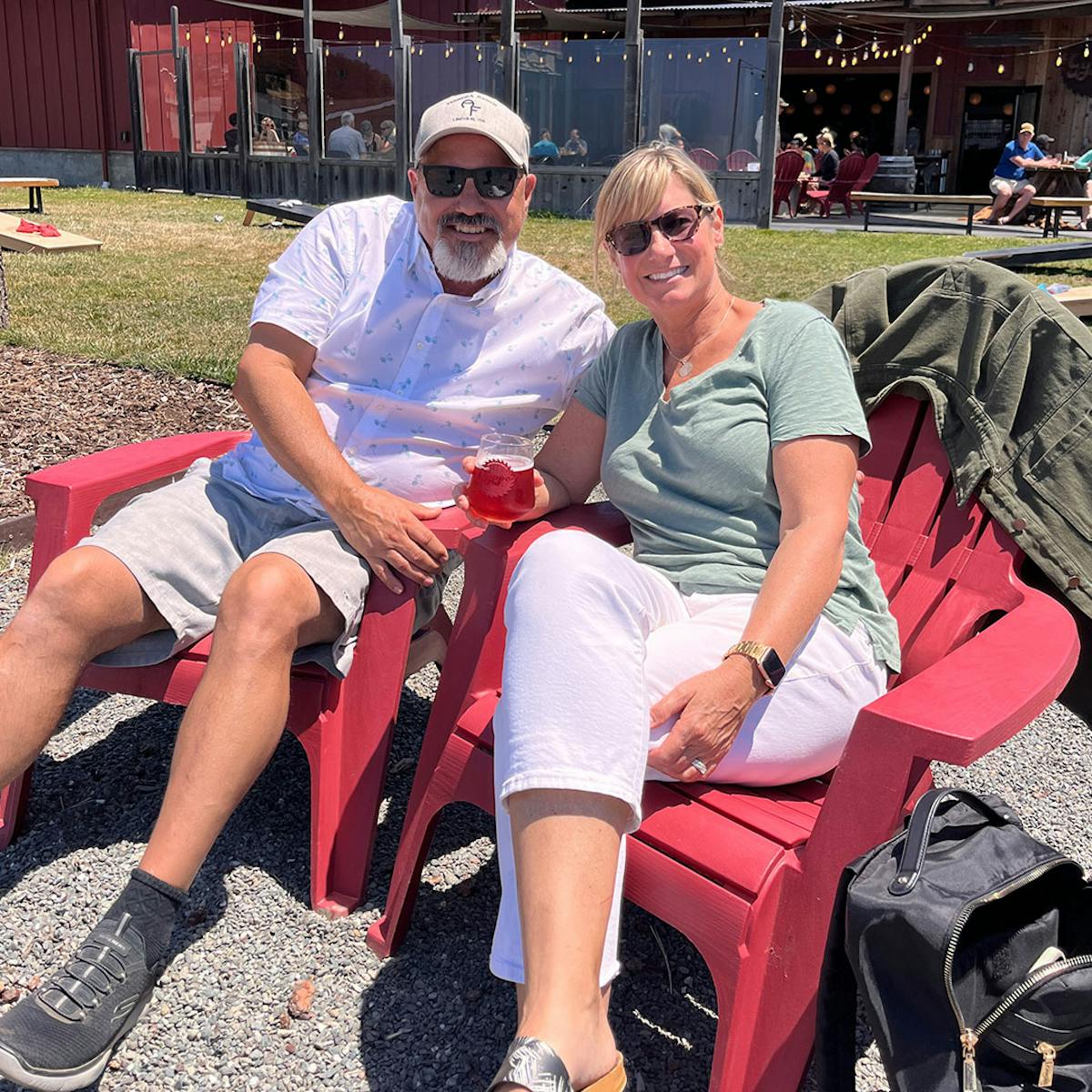 Meet Susan and her partner, celebrating her birthday at Gyppo Ale Mill! Her friends made sure it was a day to remember by organizing a surprise sing-along. The entire beer garden joined in to sing "Happy Birthday," leaving Susan thoroughly embarrassed but smiling from ear to ear. After the fun, they snuck over to these comfy chairs, enjoying the beautiful view of the ocean and the airport. Susan sipped on a refreshing Crush Cooler, savoring the moment. We're honored to have been a part of her special day. Cheers to Susan and her unforgettable birthday celebration!