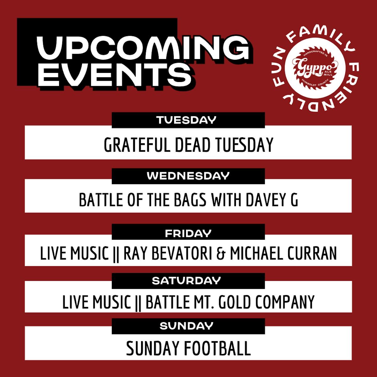 October on the Lost Coast has been absolutely stunning, and this week is the perfect time to stop by Gyppo! Whether you're looking to jam to live music, test your skills at Battle of the Bags, or just relax with a cold one and catch some football, we’ve got something for everyone. The vibe has been amazing, and with our family-friendly atmosphere, you’re sure to make some memories. Grab your friends, enjoy the fall weather, and let’s make this week unforgettable!